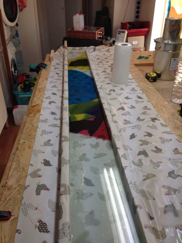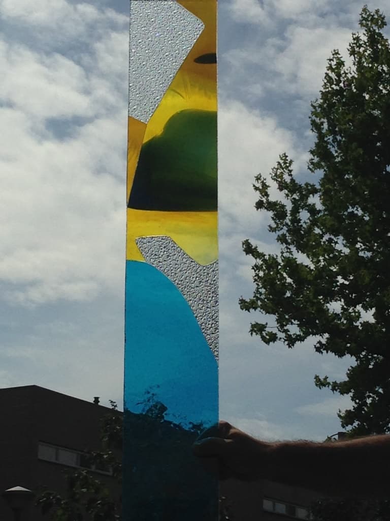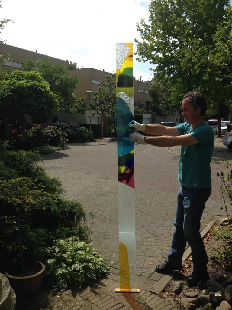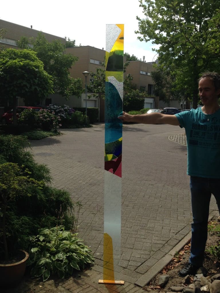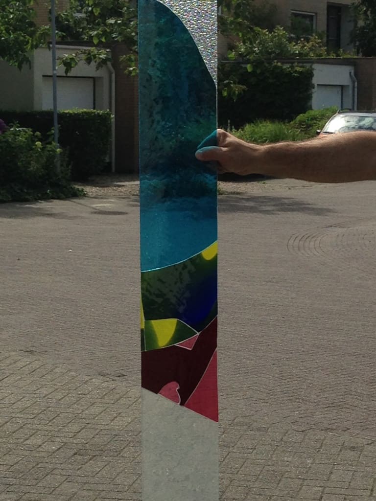 Materiaal: Basisplaat 8mm, mondgeblazen antiekglas, structuurglas in diverse kleuren. Applicatie met Silgel.