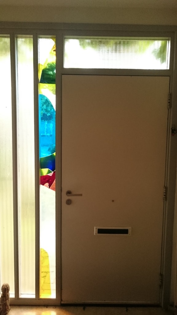 Voor opdrachtgever een raampaneel in moderne stijl mogen maken, op de plaats waar een inbreker geprobeerd heeft de haldeur te ontzetten. In de hal zat draadglas van een fabriek die inmiddels niet meer bestaat. Het glas is niet meer te krijgen en de eigenaars wilden een vrolijke toevoeging en kleur in de hal. Na het voorstellen van diverse ontwerpen is de keuze gevallen op dit paneel. Erg veel plezier gehad met het maken.