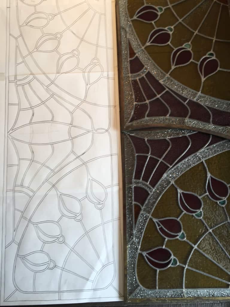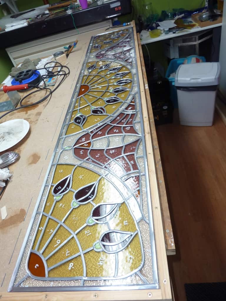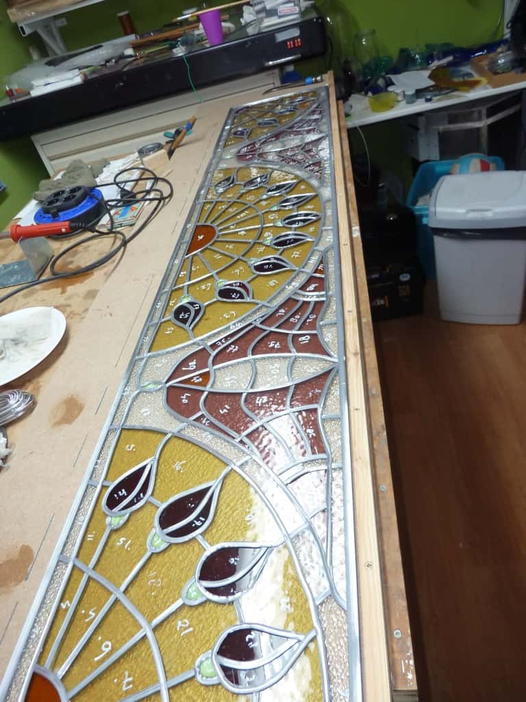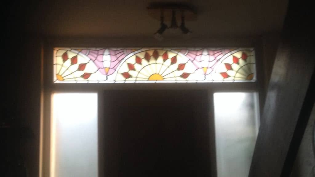 Toelichting: voor opdrachtgever een raampaneel in de stijl van de art-nouveau mogen maken, naar het 100-jaar oude origineel. Hiervoor is een enkelvoudig paneel gespiegeld en verlengd. Hoewel het vaak moeilijk is om exact hetzelfde glas te vinden, is het resultaat naar volle tevredenheid geïnstalleerd.