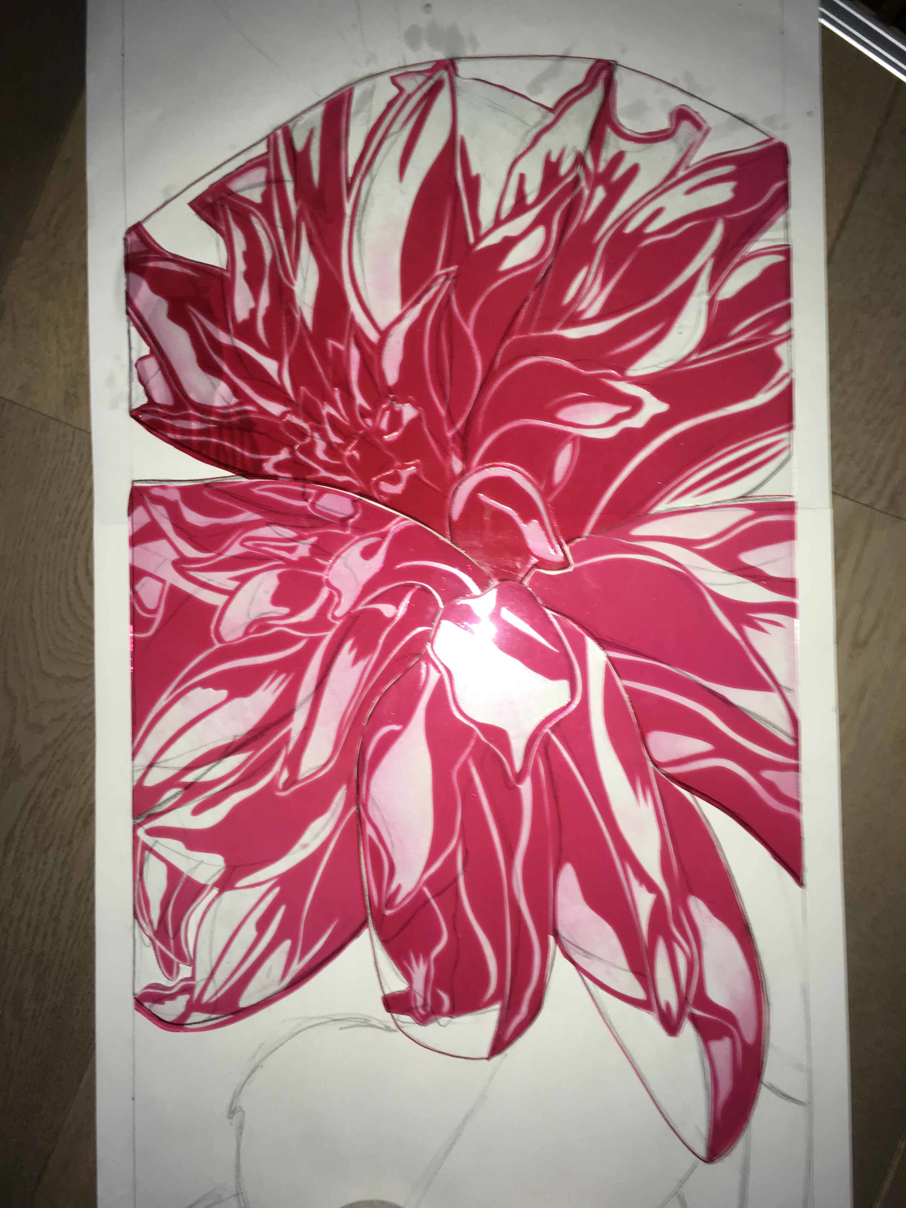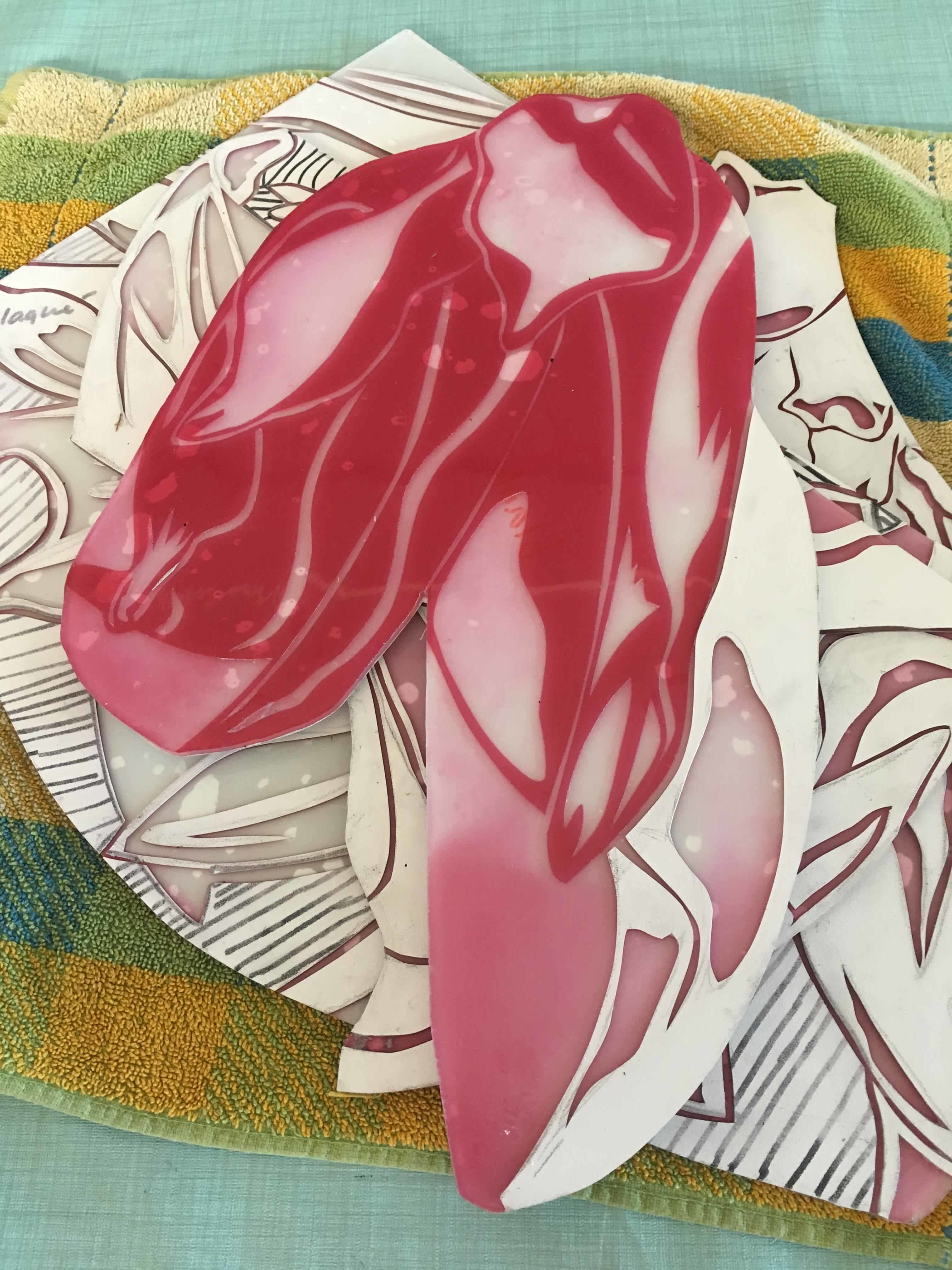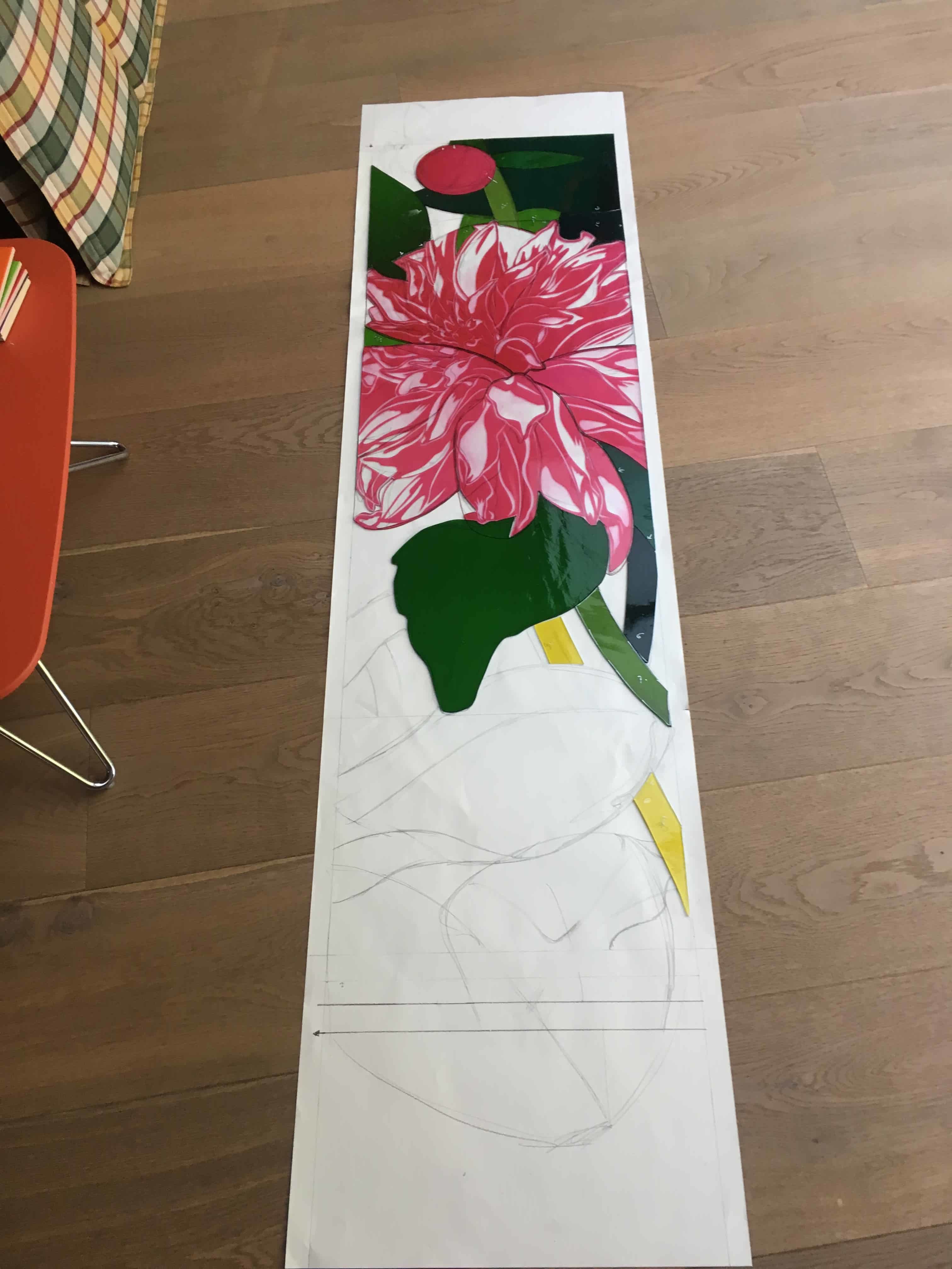 Materiaal: Plaqué-Uberfang glas in de kleur rose op blank, seleen geel op blank en mondegeblazen antiek glas van GlasHuette Lamberts.