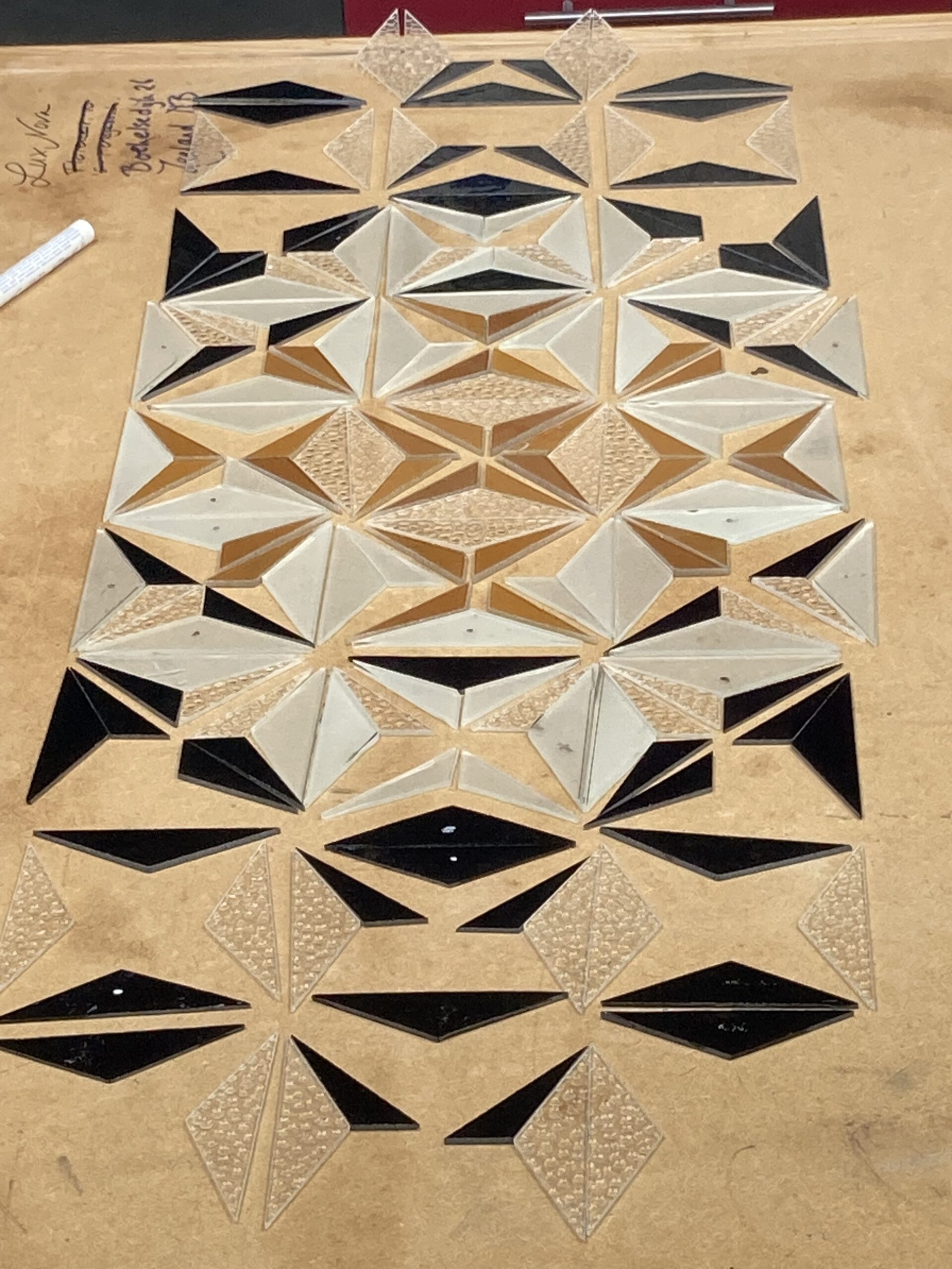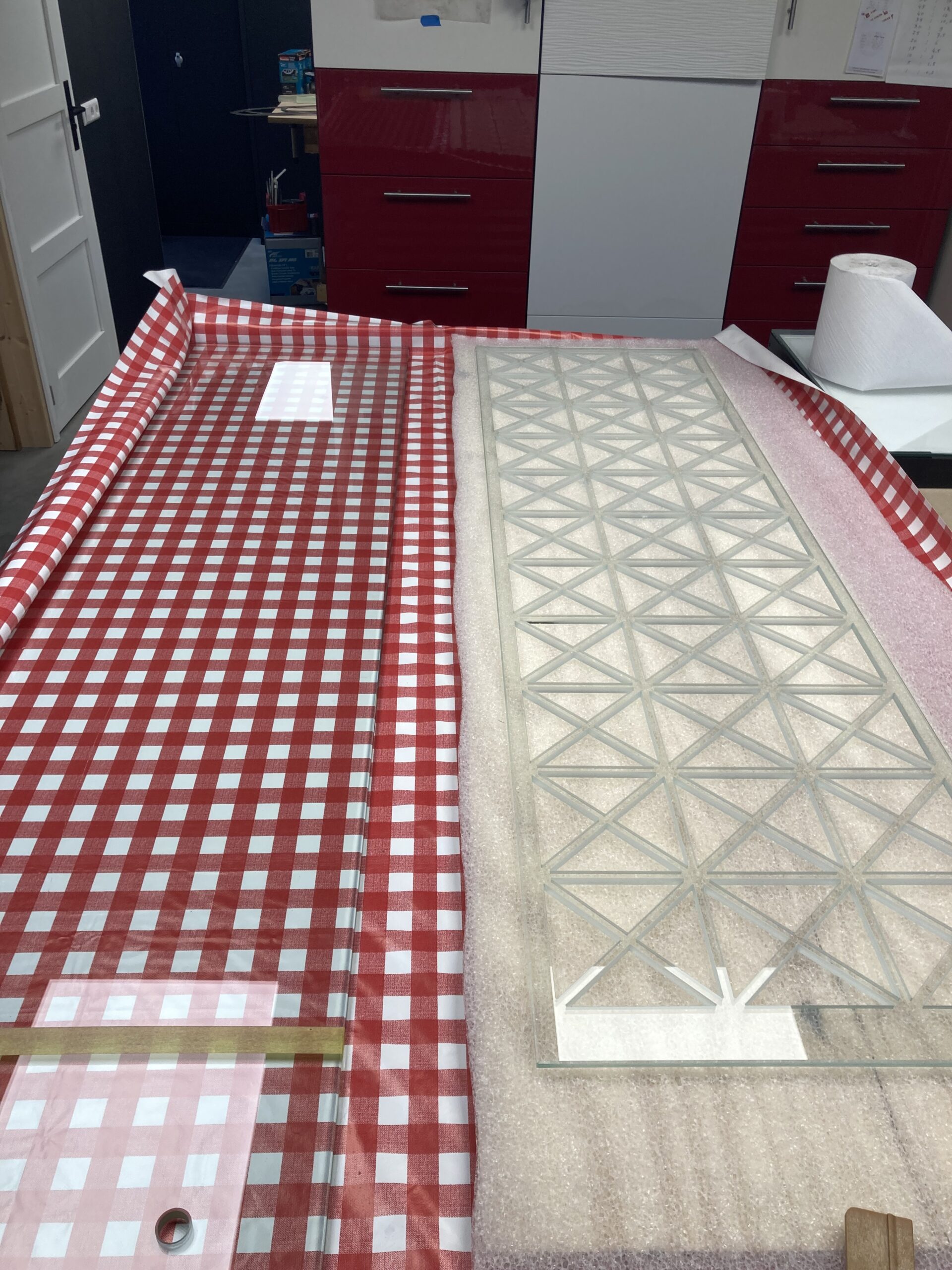 En daarzie! Ik presenteer met veel plezier, ondanks de gehavende handen en het risicovolle werk; de Intarsia techniek. Van oudsher bekend en toegepast op allerhande materialen. Voor zover ik weet, níet op of met glas op deze manier. © Lux-Nova, per 1 oktober 2025.
