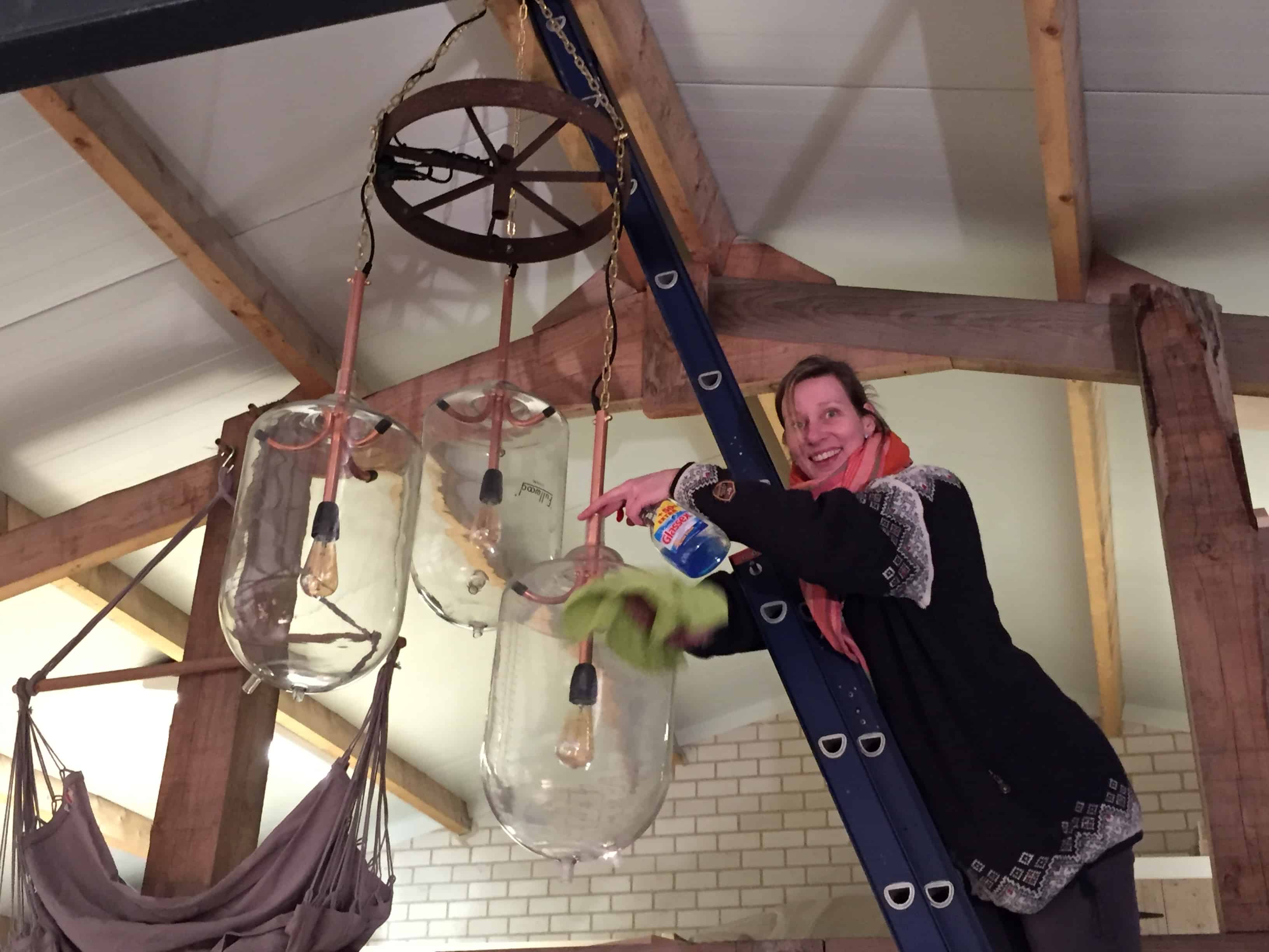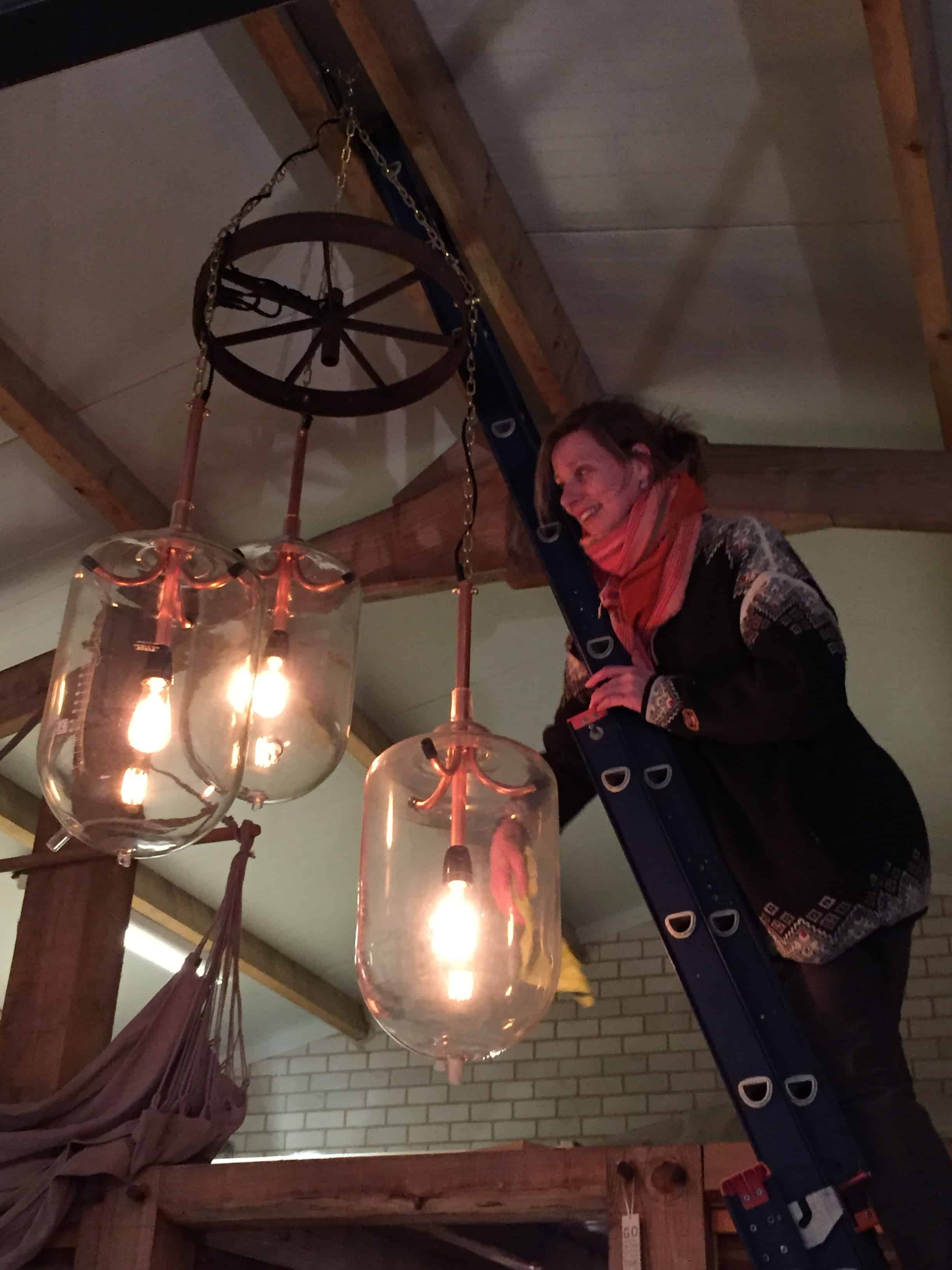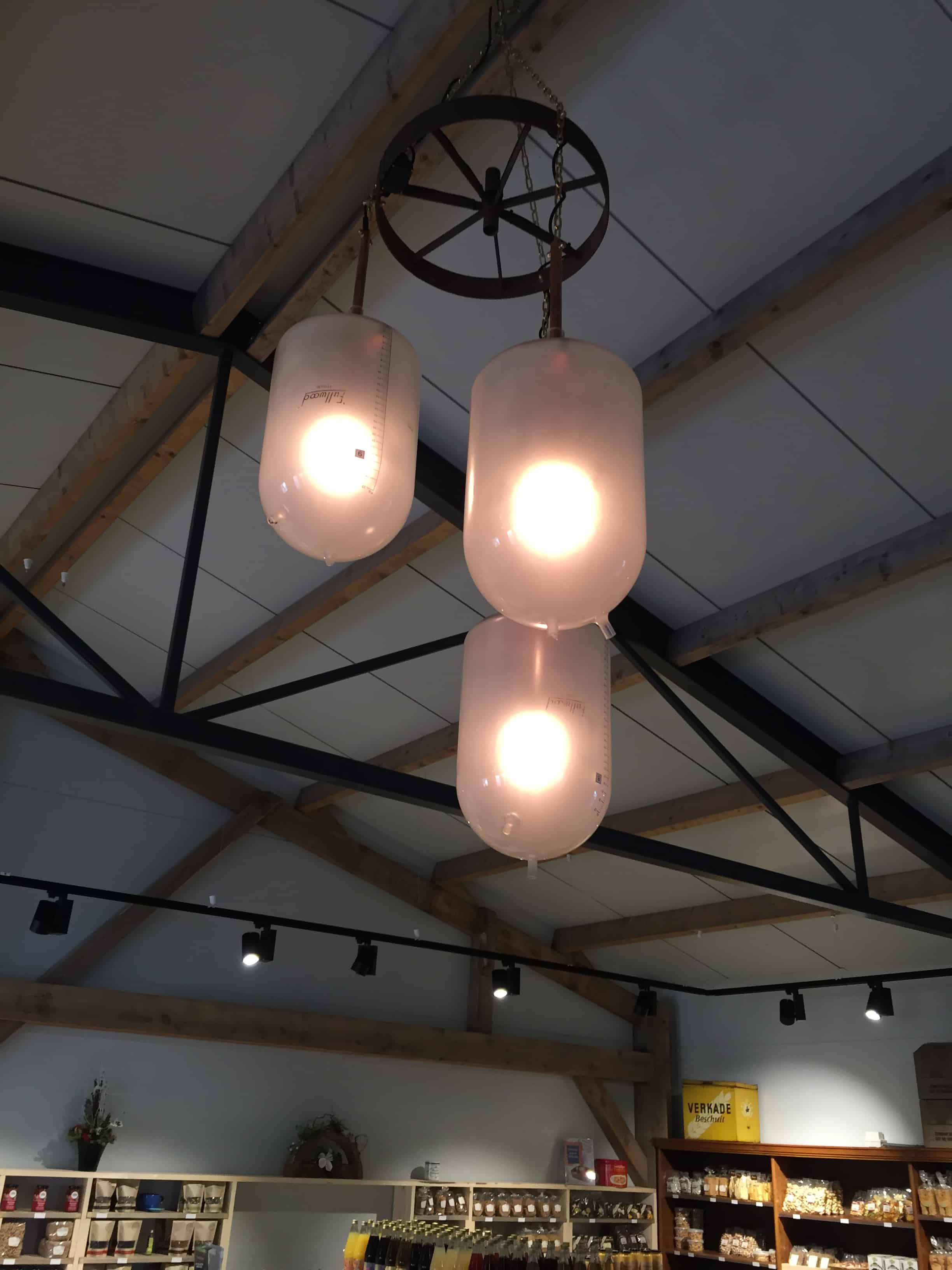 Ter gelegenheid van de opening van Landwinkel Valenkamp zijn twee kroonluchters gemaakt. Geheel in stijl met de filosofie van deze leuke jonge ondernemers is bijzonder materiaal hergebruikt. De luchters bestaan uit sets van drie oude melkmeetglazen, uit de originele boerderij. Op deze locatie was een melkveehouderij gevestigd. De nieuwe eigenaars hebben hier een Landwinkel geopend met een theeterras waar het goed toeven is. Uniek in Brabant: het ‘blote-voeten-pad’, een echte aanrader.