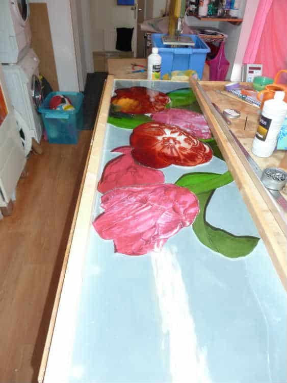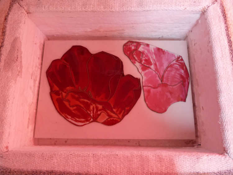 Materiaal: Plaqué-Uberfang glas in de kleur rood op blank, rose op blank en rood op blauw van GlasHuette Lamberts.